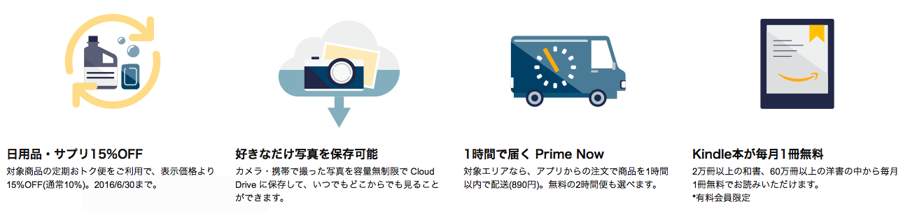 上記のもの以外にも、Kindle(本、書籍)や商品の割引など様々な特典があります。